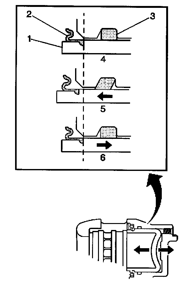 3. While the brake system is at rest (4), observe the position of the caliper piston (1) in relation to the caliper housing.