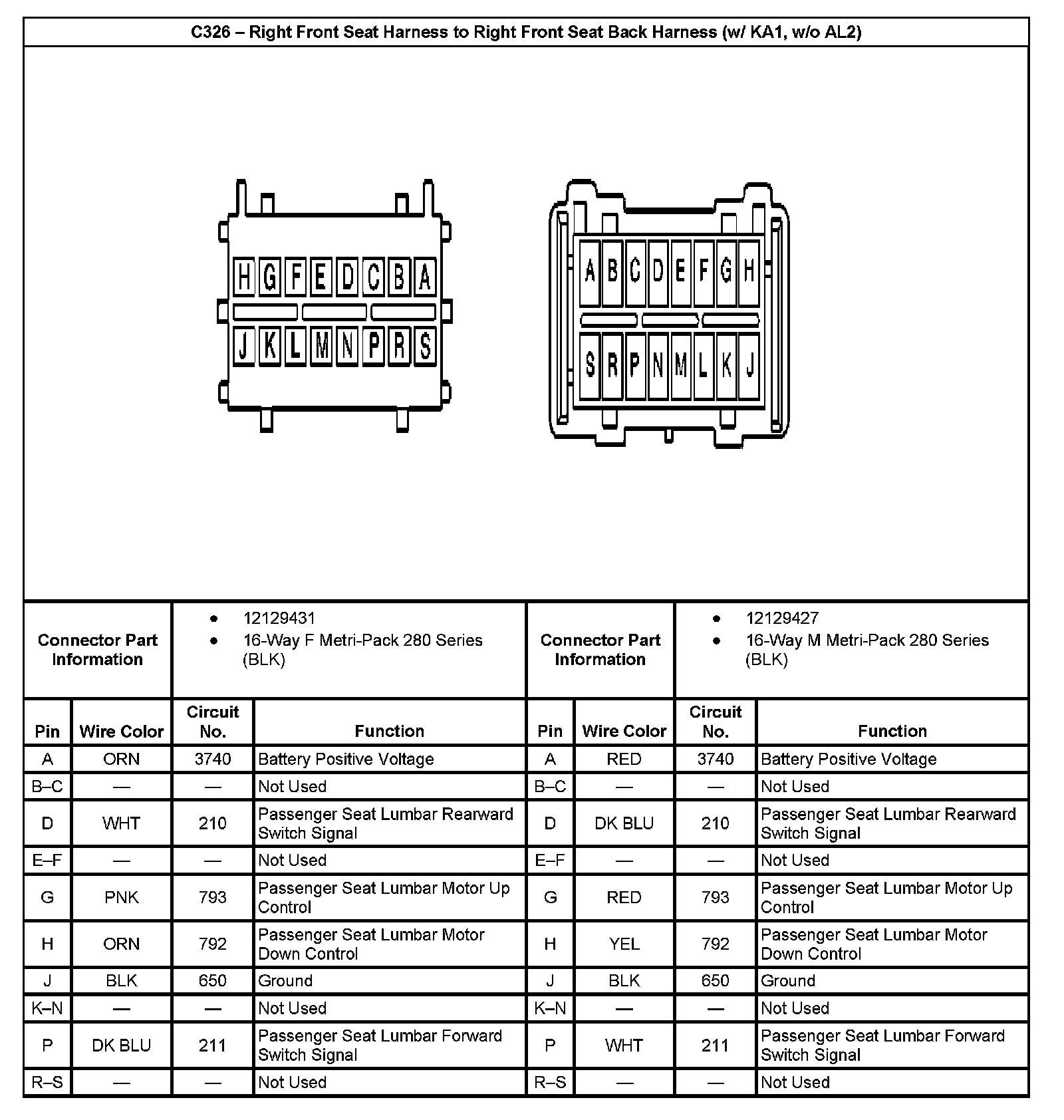 C326 - Right Front Seat Harness To Right Front Seat Back Harness (With RPO Code KA1, Without RPO Code AL2):
