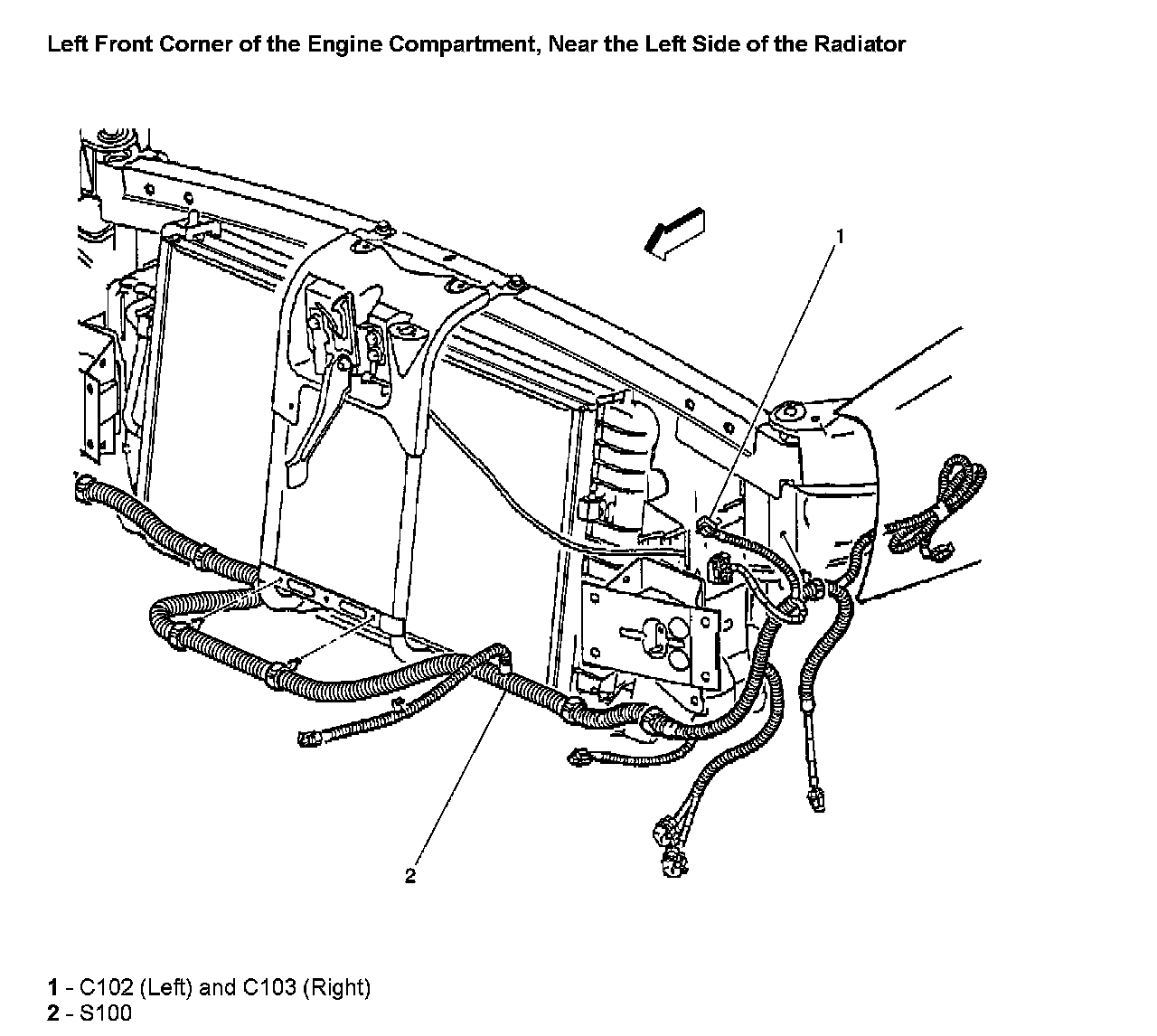 Left Front Corner of the Engine Compartment, Near the Left Side of the Radiator