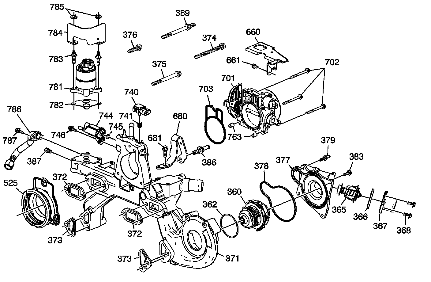 Water Crossover and Throttle Body Assembly360. Water Pump