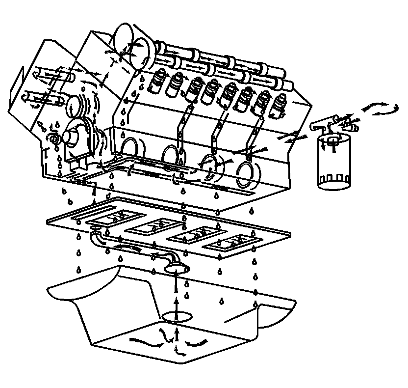 Oil returns to the sump either through the cam chain area or by way of cast oil drain back passages on the outside walls of the cylinder heads, upper and lower crankcases and oil pan. The lubrication system also includes a baffle, attached by the main bearing bolts, and channels oil thrown from the crankshaft back into the oil sump.