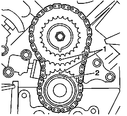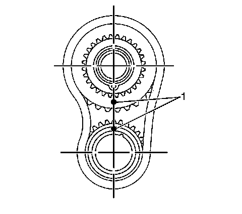 2. Align the timing marks (1) of the camshaft intermediate drive shaft sprocket and crankshaft sprocket. Ensure the marks are aligned vertically.