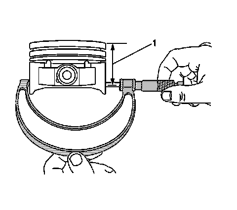 1. Using an outside micrometer, measure the width of the piston 40 mm (1.575 inch) below the crown (top) of the piston at the thrust surface which is perpendicular to the centerline of the piston pin (1).