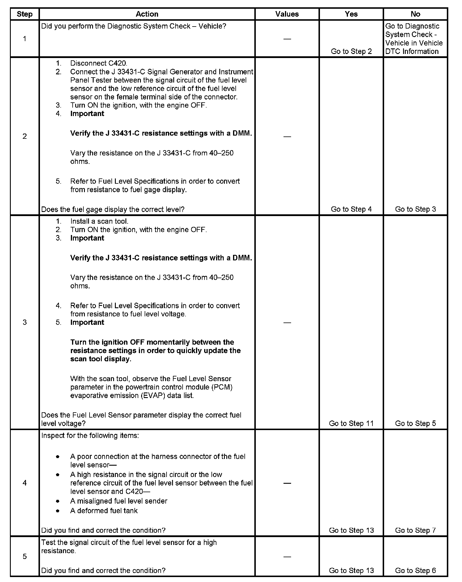 - Refer to Fuel Level Specifications in order to verify the correct readings for the fuel level sensor. The Fuel Level Sensor voltage parameter is available on the scan tool in the powertrain control module (PCM) evaporative emission (EVAP) data list.