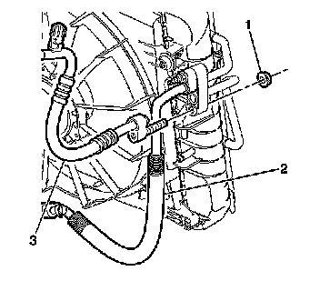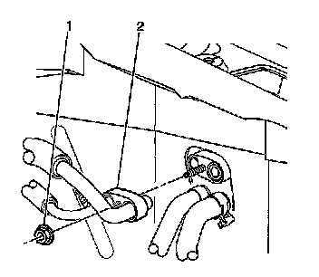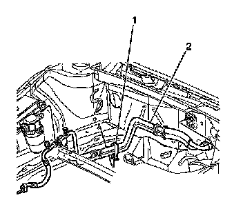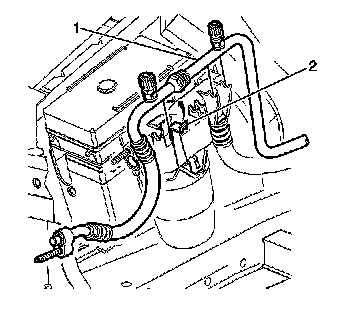 3. Remove the evaporator hose (2) from the hold down (1) on the frame rail.