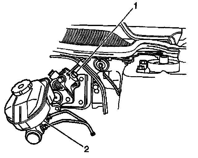 2. Remove the master cylinder retaining nuts and position the master cylinder (2) approximately six inches away from the hydro boost unit.
