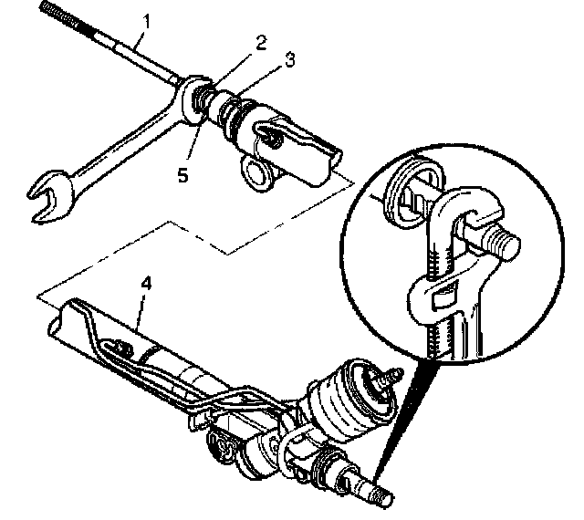 5. Place a pipe wrench on the rack (5) next to the inner tie rod housing (4).