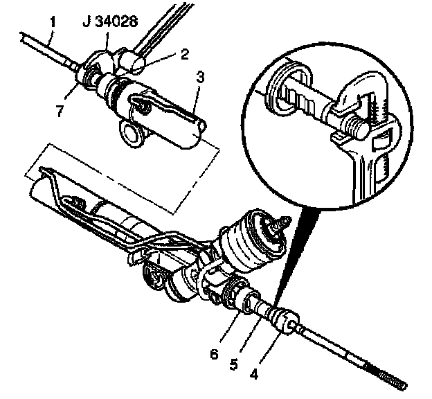 10. Place a torque wrench and J 34028 on the flats of the inner tie rod housing (7).