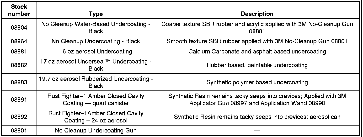 Below is a listing of Undercoat coatings and Closed Cavity coatings that GM believes to be reliable. While others may exist, we have found these products, or equivalents to them, can be used with satisfactory results. Always use these products according to their manufacturer's recommendations.
