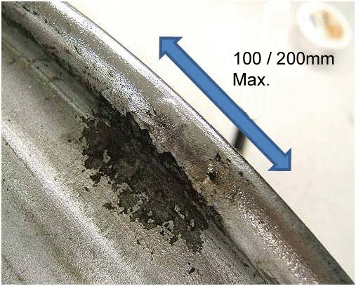 - For vehicles that have exceeded 32,186 km (20,000 mi), the total allowable combined linear area of repairable corrosion is 200 mm (8 in) or less. If the total area(s) of corrosion exceed these dimensions, the wheel should be replaced.