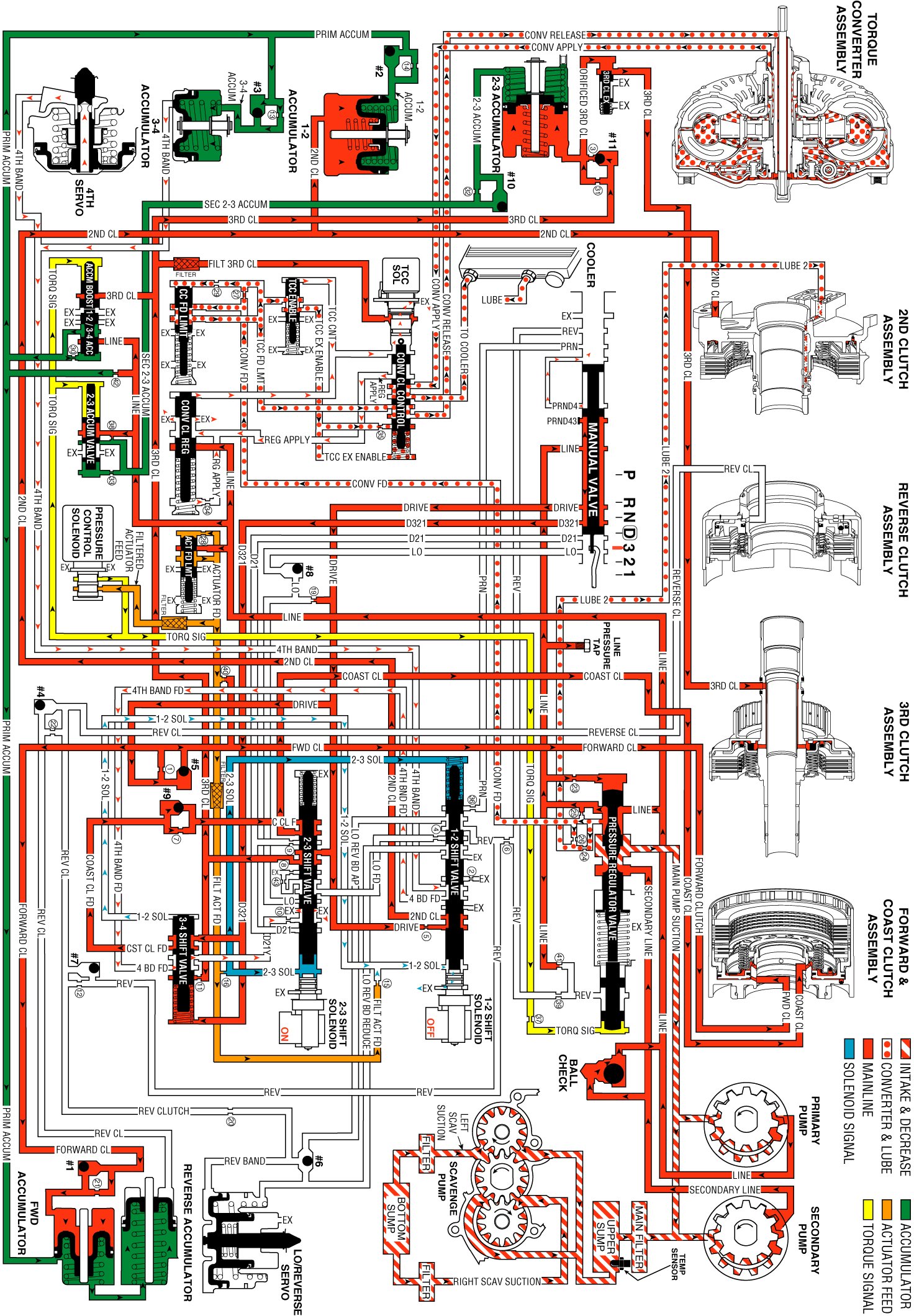 Mechanically moved through the gear selection, the manual valve allows line pressure to enter the D321 fluid circuit, and the PRDN4 fluid exhausts at the valve. D321 fluid is then routed to the spring end of the 3-4 shift valve.