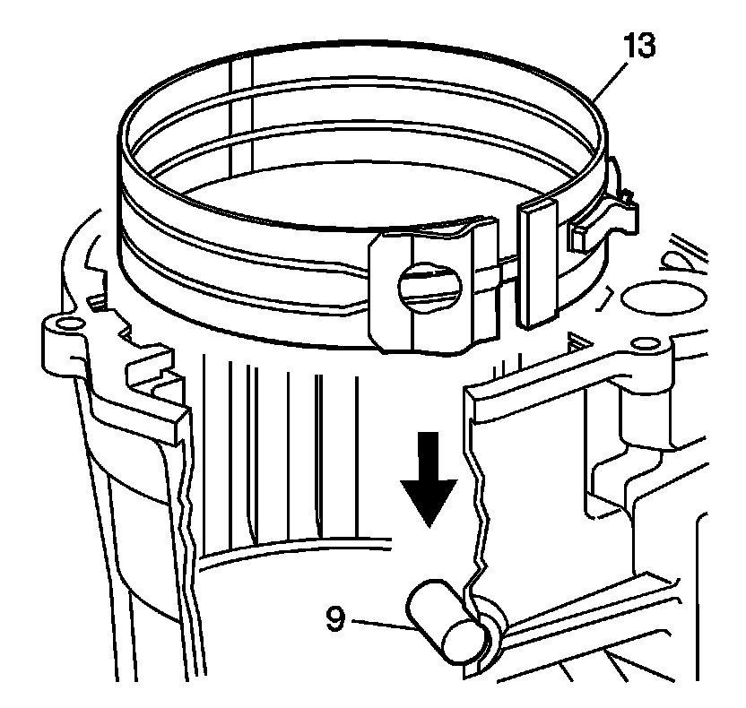 1. Install the low reverse band (13) into the case. Be sure to properly anchor the band in the case with the servo pin stop at the case bore.