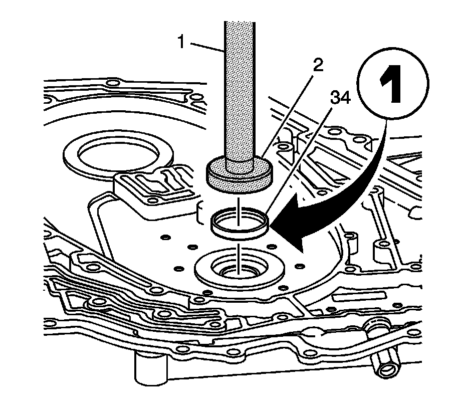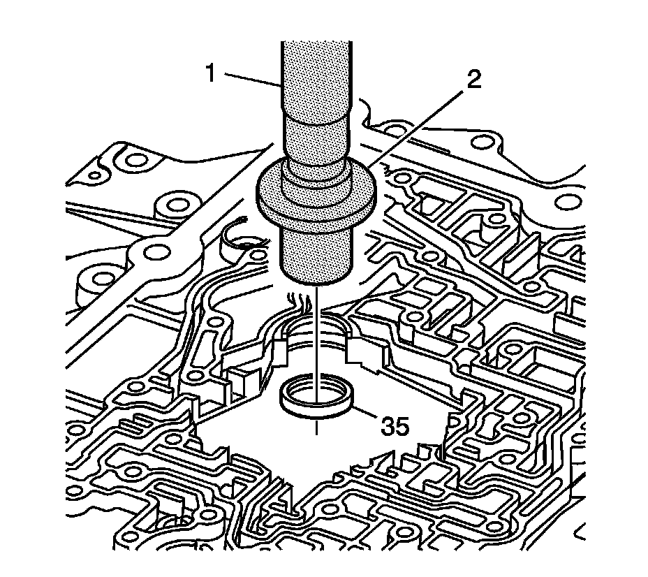 1. Using J 7079-2 (1) and the remover side of the J 39062 (2), remove the case cover to turbine shaft seal (35).