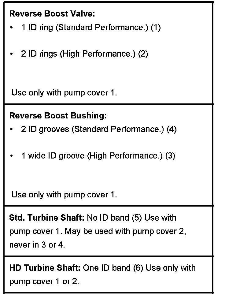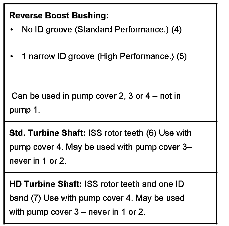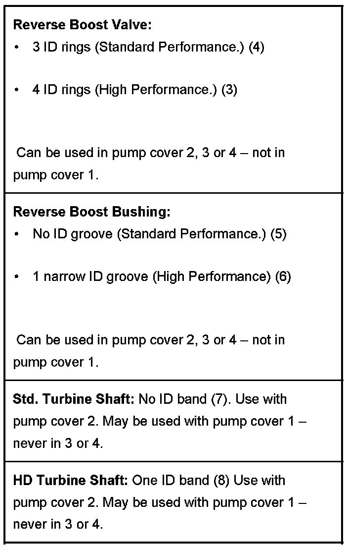 Pump Cover 1 - Initially Manufactured in 1998: This design uses two similar reverse boost valves and bushings. Rings and grooves identify the valve and bushing type. There are two types of boost valves, standard and high performance, each with a corresponding bushing. The pressure regulator valve (216), the pressure regulator valve spring (217) and the pressure regulator isolator spring (218) remain unchanged.