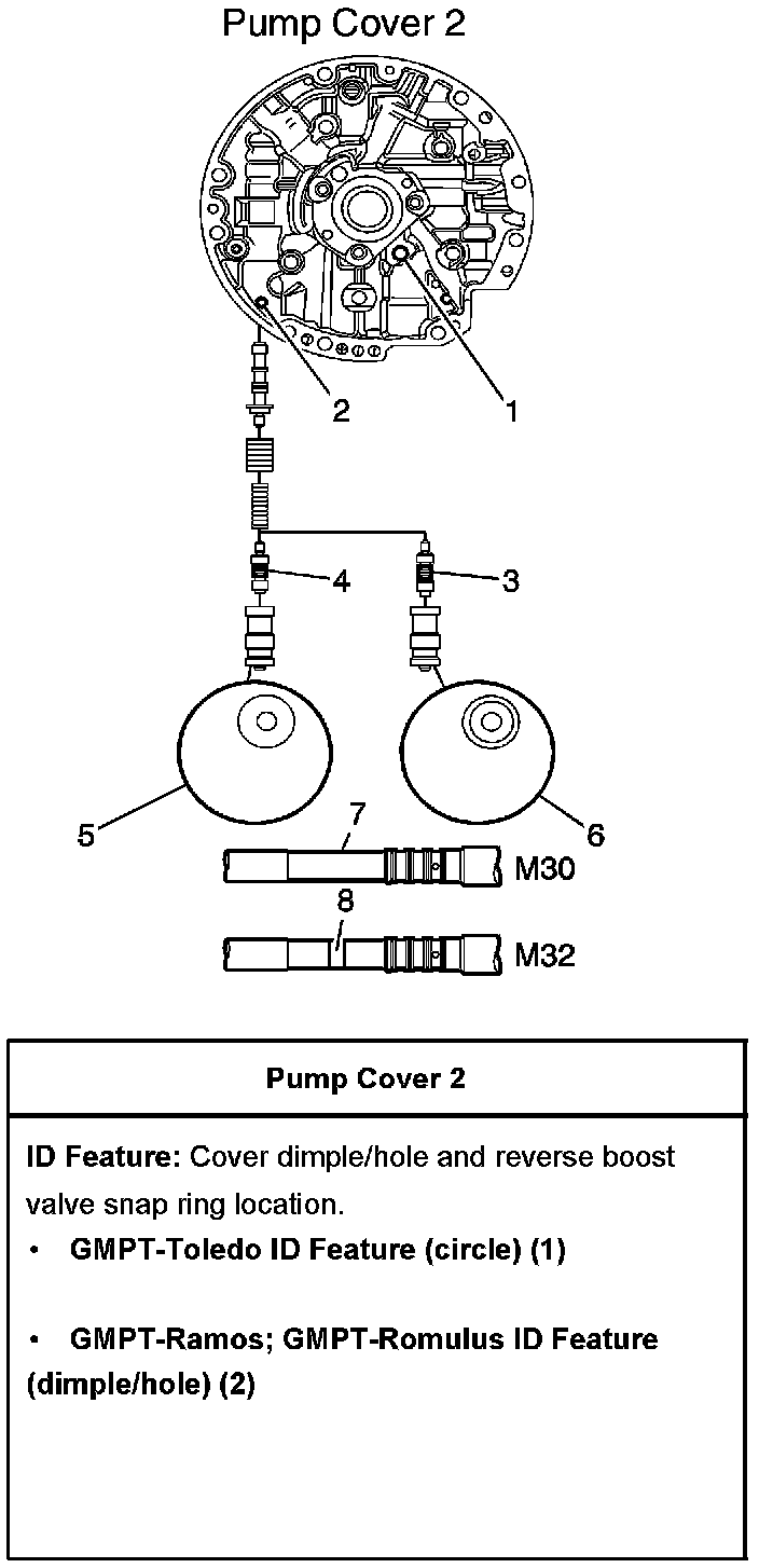 To identify this pump cover, look for a stamped circle surrounding a letter on the machined surface below the stator shaft (View 1A), or a dimple or slight hole in-line with the boost valve bore opening (View 1 B). The pump cover with the stamped circle is manufactured at the Toledo transmission plant. Pump covers with the dimple/hole are manufactured at the Romulus, Michigan or Ramos, Mexico transmission plant.