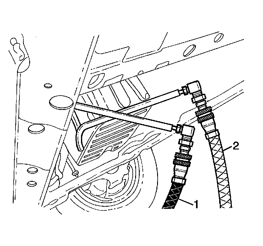 1. Connect the J 45096 adapters (1) to the vehicle's transmission oil cooler supply and return lines at the transmission.