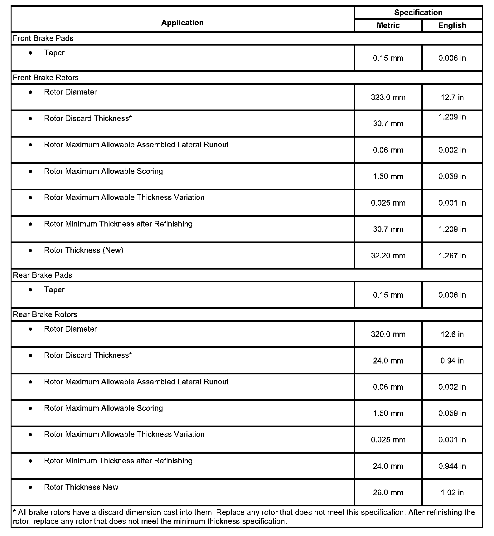 Disc Brake Component Specifications