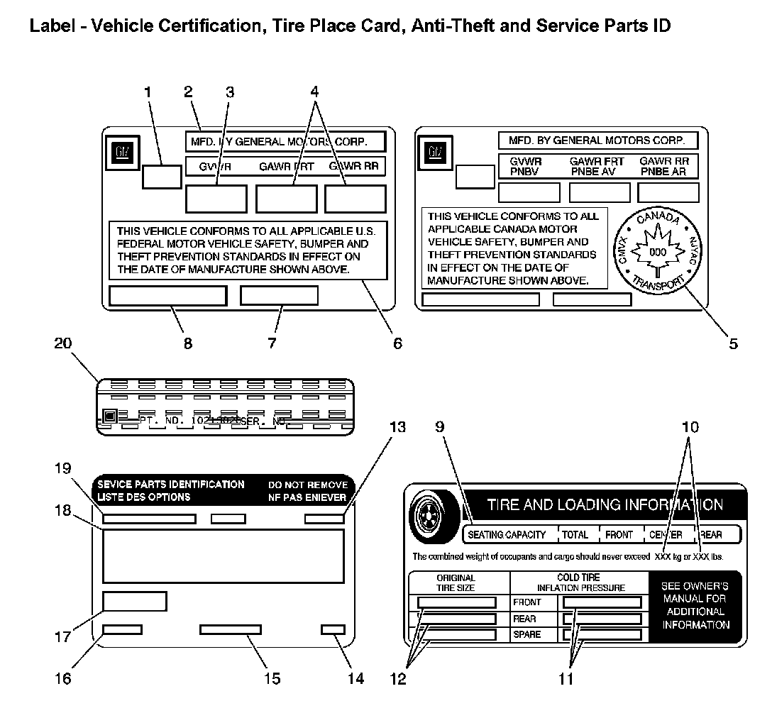 Label - Vehicle Certification, Tire Place Card, Anti-Theft And Service Parts ID: