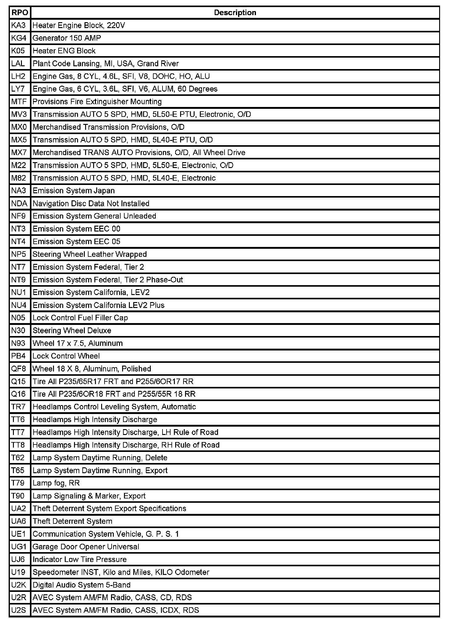 The table provides the description of the Regular Production Option (RPO) codes that are available on the vehicle. The vehicle's RPO list is printed on the Service Parts Identification Label.