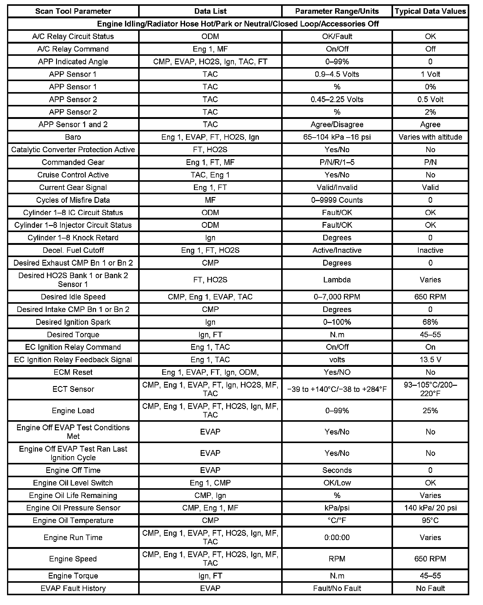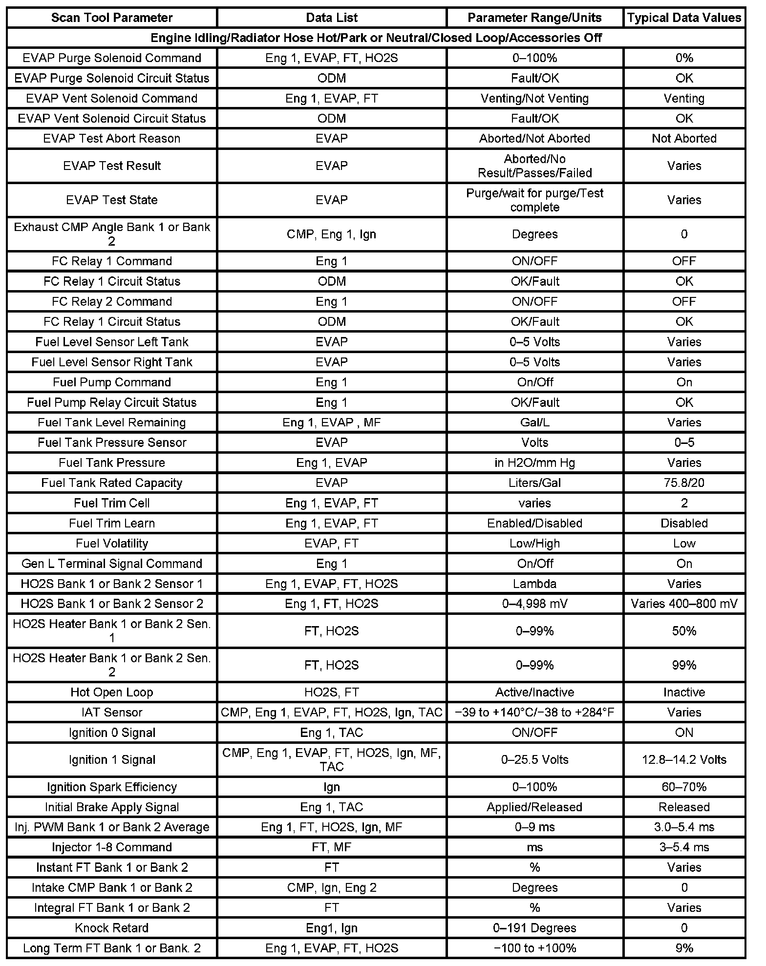 The Engine Scan Tool Data List contains all engine related parameters that are available on the scan tool. The list is arranged in alphabetical order. A parameter may appear in any one of the data lists, and in some cases may appear more than once, or in more than one data list in order to group certain related parameters together.