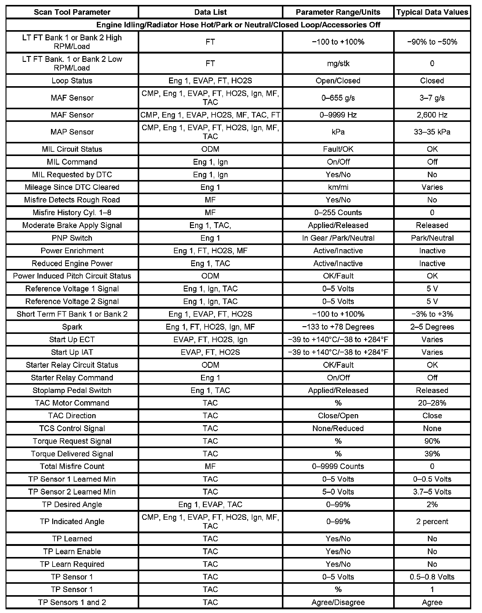 Scan tool values from a properly running engine may be used for comparison with the engine you are diagnosing. The Engine Scan Tool Data List represents the values that would be seen on a normal running engine.