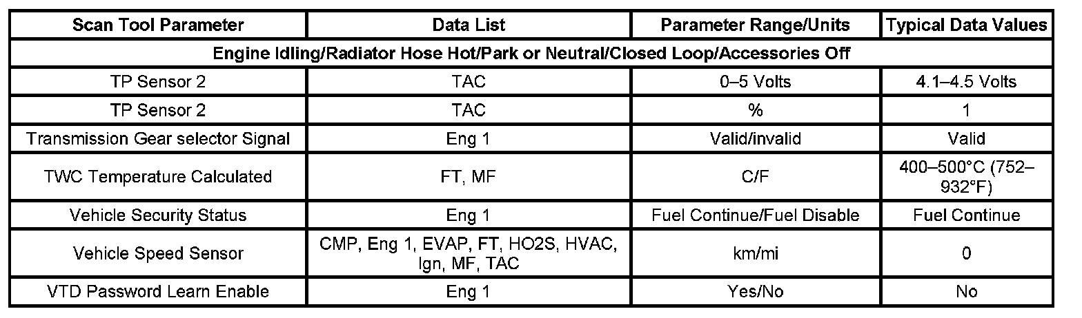 Only the parameters listed below are referenced in this Service Data for use in diagnosis. If all values are within the typical range described below, refer to Symptoms - Computers and Control Systems for diagnosis. Symptom Related Diagnostic Procedures