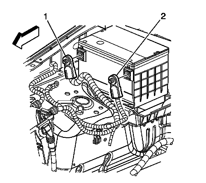 4. Depress the locking tabs (1) on the side of the battery heat shield.
