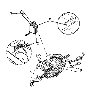 5. Depress the locking tab (2) on the windshield wiper and washer switch (1) and remove the switch from the steering column.