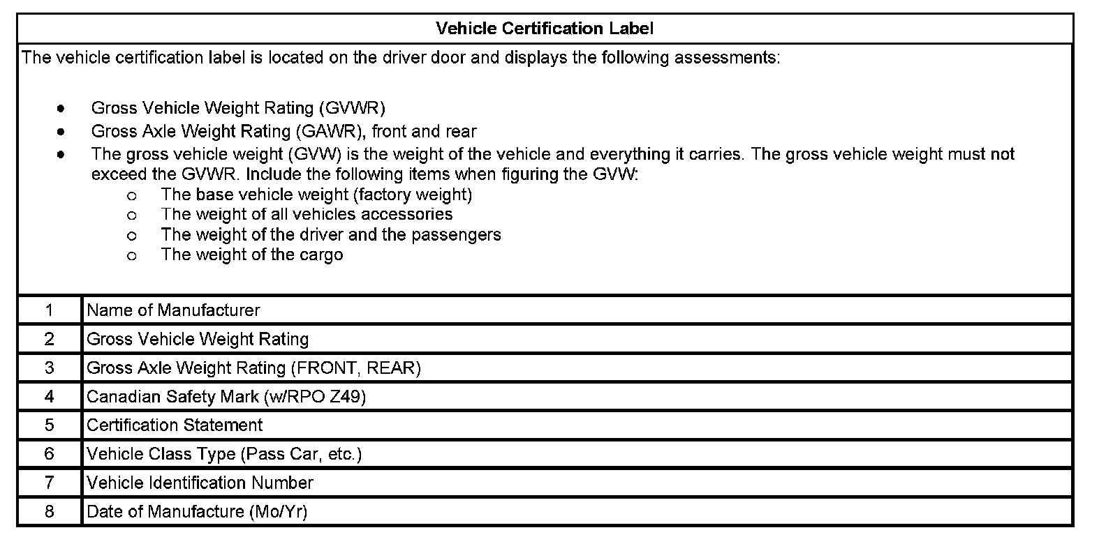 Label - Vehicle Certification, Tire Place Card, Anti-Theft And Service Parts ID: