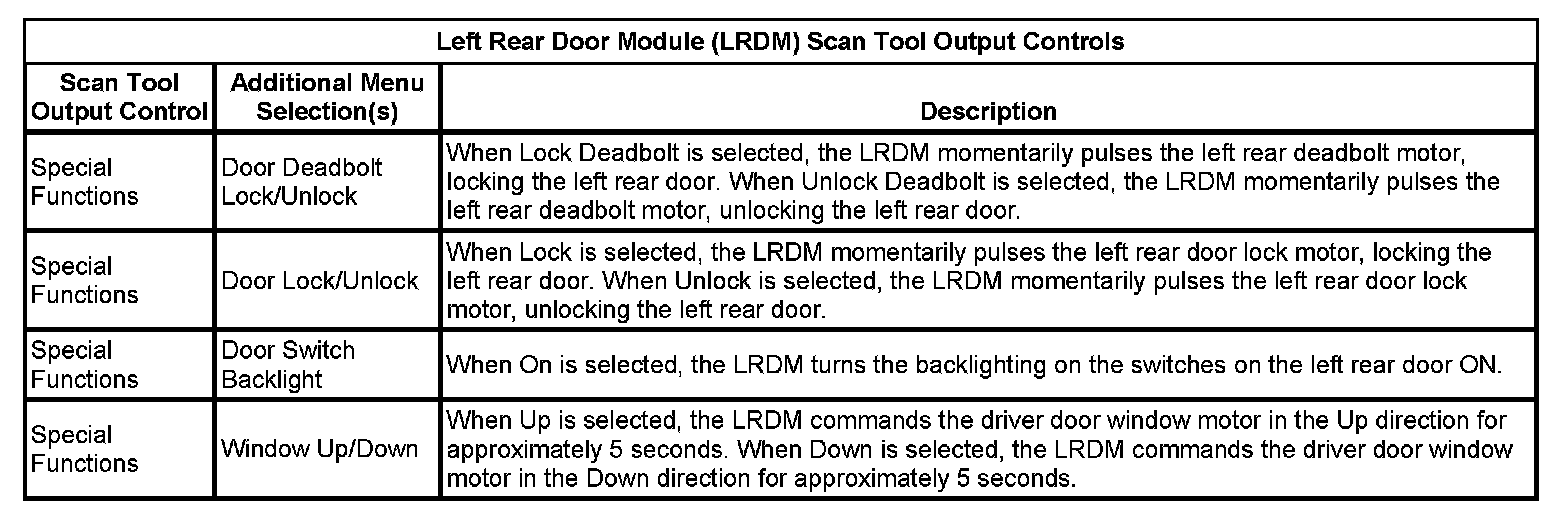 Left Rear Door Module (LRDM) Scan Tool Output Controls: