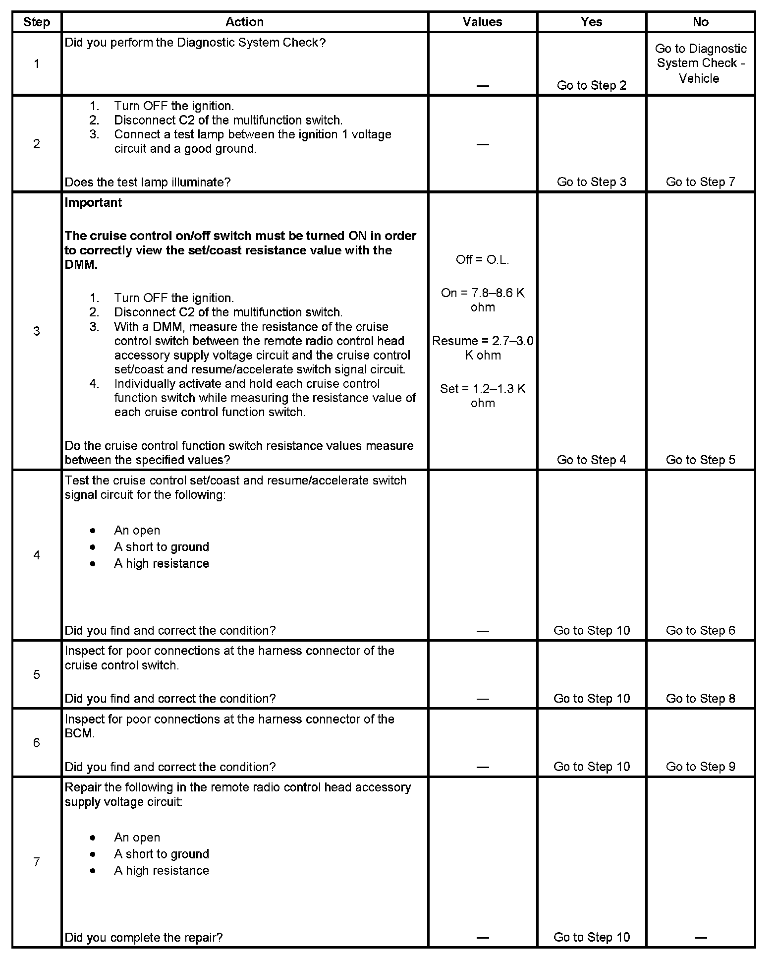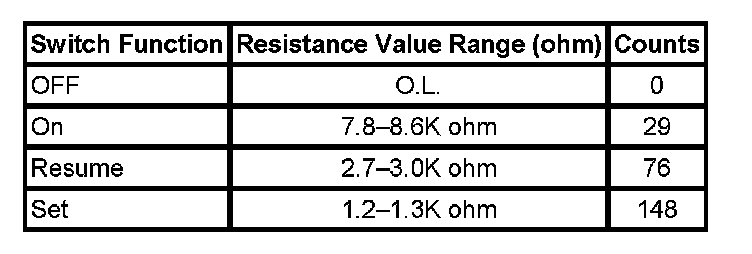 The following are the correct switch resistance value ranges and the correct counts that are displayed in the Cruise parameter in the Body and Accessories / Cruise Control / IPM / Inputs data list, when each switch is pressed individually. If no switch is pressed the resistance value should be infinite.
