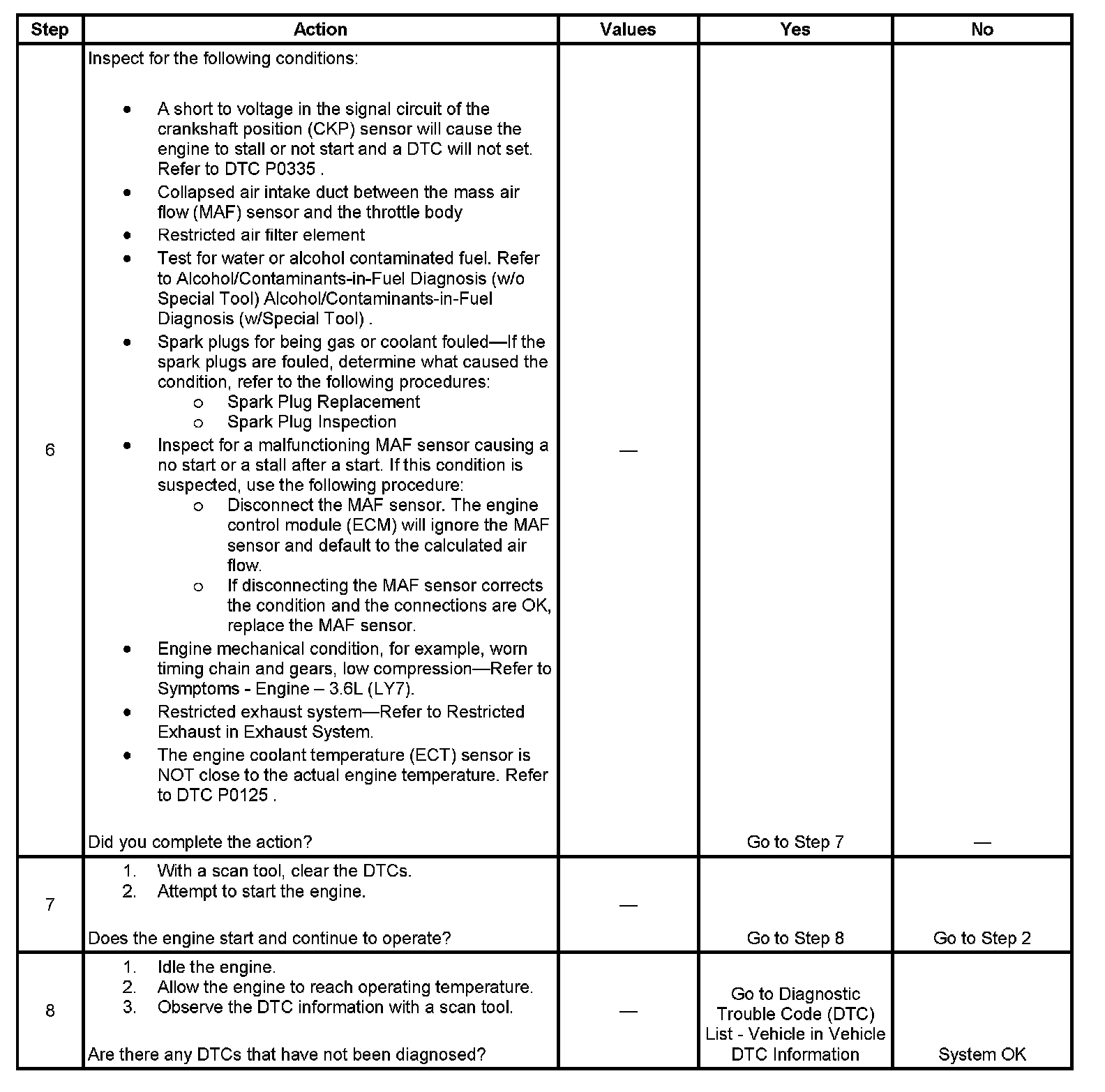 - A short to voltage in the signal circuit of the CKP sensor will cause the engine to stall or not start and a DTC will not set.