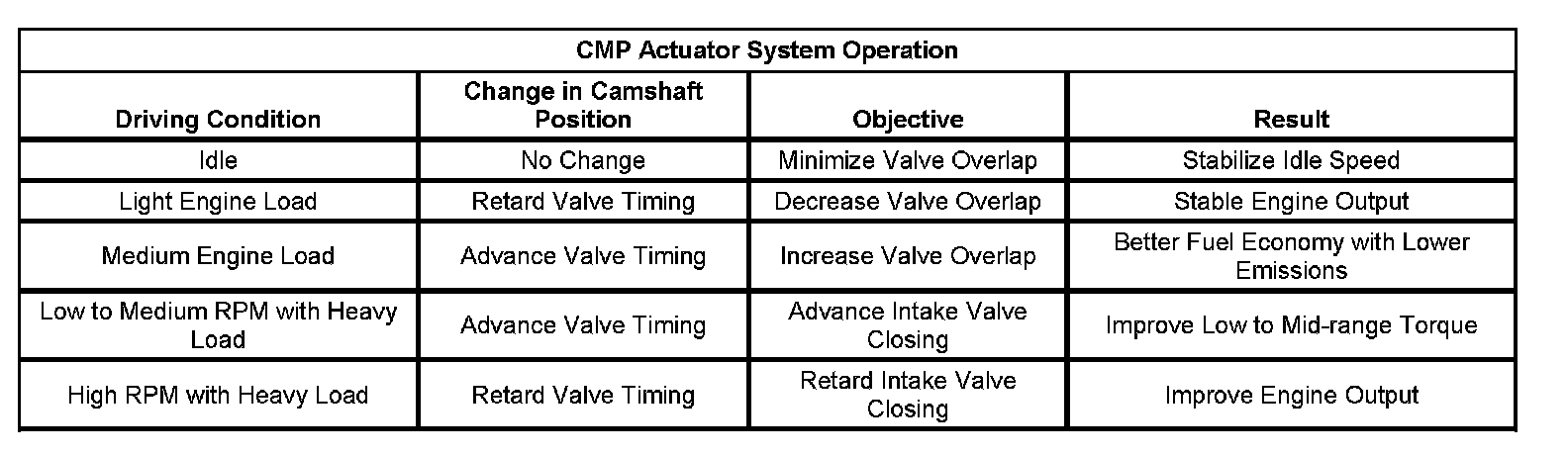 The camshaft actuator system enables the engine control module (ECM) to change camshaft timing of all 4 camshafts while the engine is operating. The CMP actuator assembly (15) varies the camshaft position in response to directional changes in oil pressure. The CMP actuator solenoid valve controls the oil pressure that is applied to advance or retard a camshaft. Modifying camshaft timing under changing engine demand provides better balance between the following performance concerns: