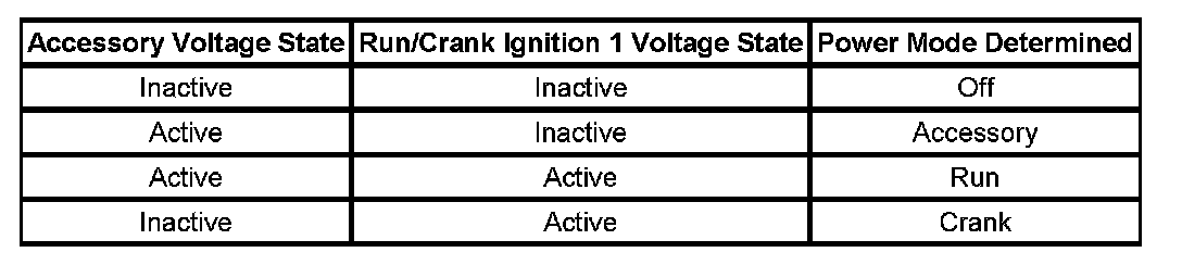 The ECM and TCM remain in the last known power mode state until it can determine its backup system power mode based on their discrete Accessory voltage and Run/Crank Ignition 1 voltage inputs.