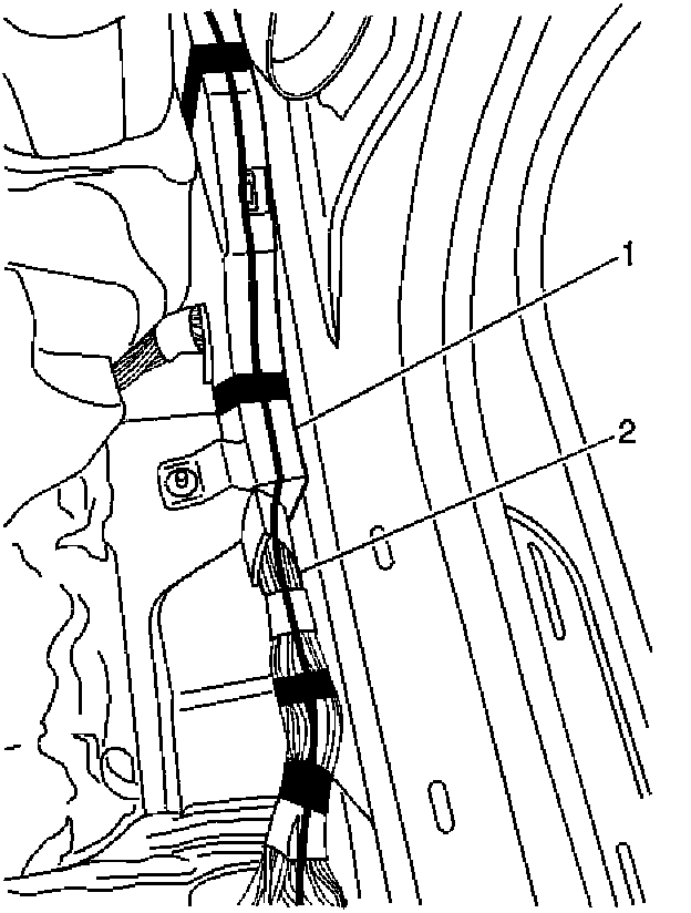 27. When the harness (2) exits the conduit (1) in the rear floor pan area, continue routing and taping the new wire to the outside of the existing harness.