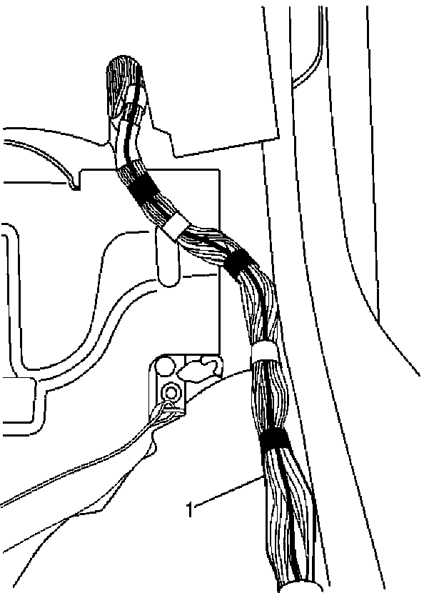 28. Continue taping the new wire to the harness (1) as it goes up to the "C" pillar area.