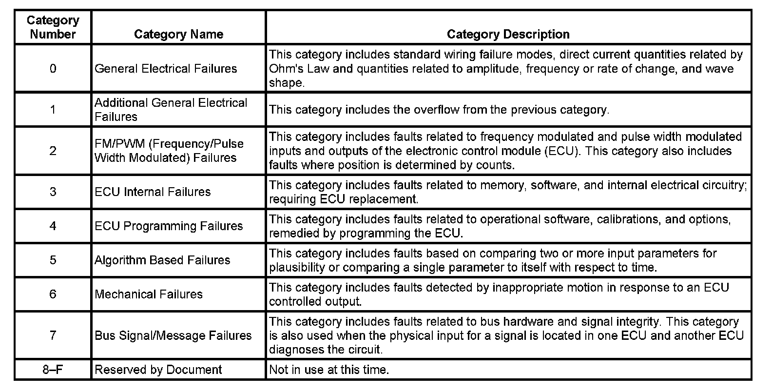 The DTC symptom is made up of 2 alphanumeric digits. The first digit following the DTC indicates the DTC symptom category. There are 16 possible categories available in the range of 0 through the letter F. Currently there are 8 categories in use, 0 through 7. These 8 categories together with their definitions are given.
