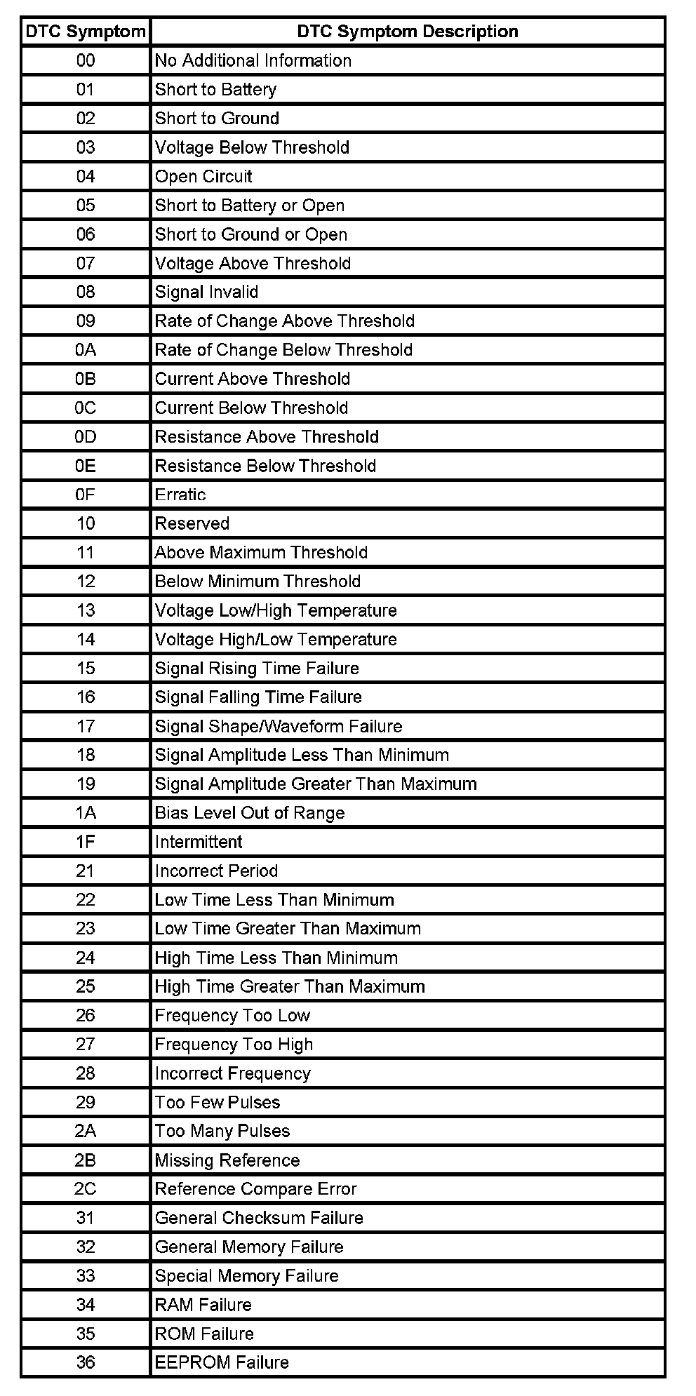 A DTC symptom is a 2-digit number which adds additional detail to a DTC. The DTC symptom provides additional information without requiring a large increase in the number of new DTCs.
