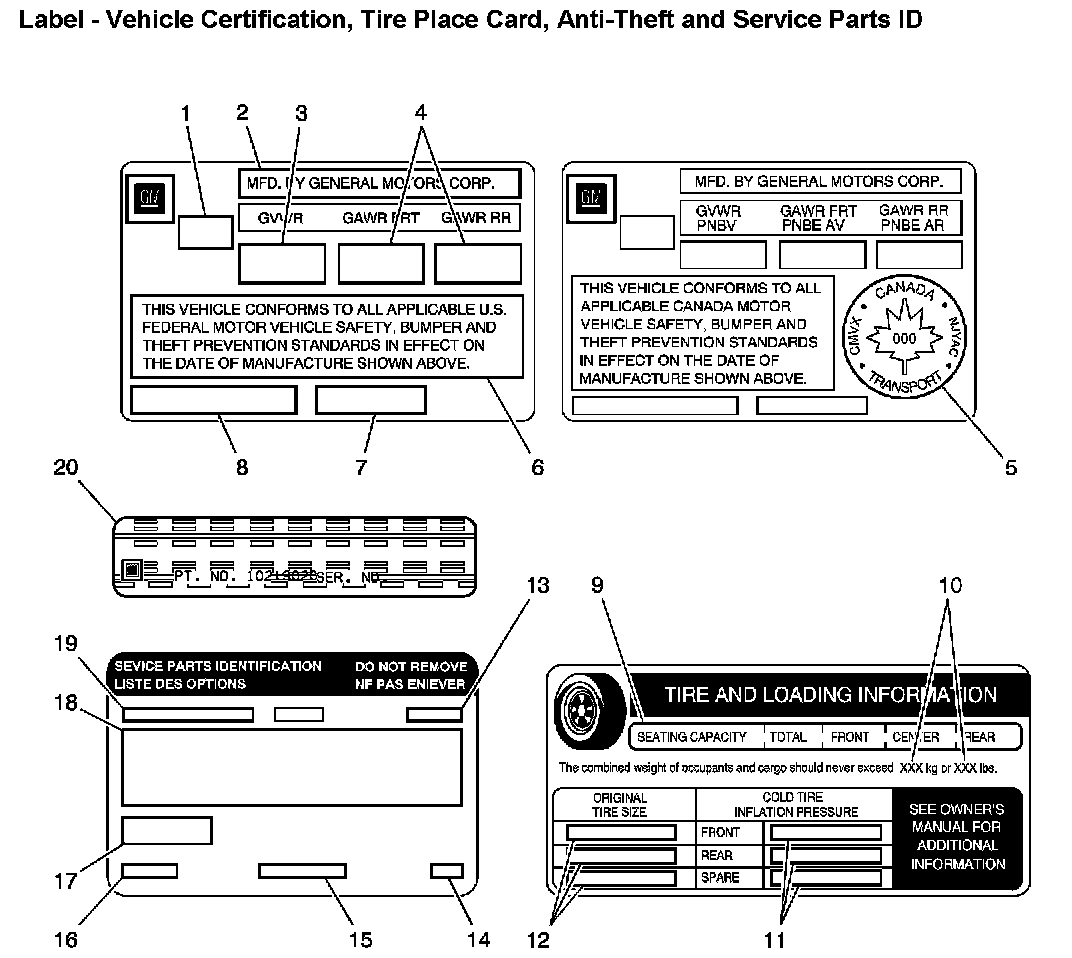 Label - Vehicle Certification, Tire Place Card, Anti-Theft And Service Parts ID: