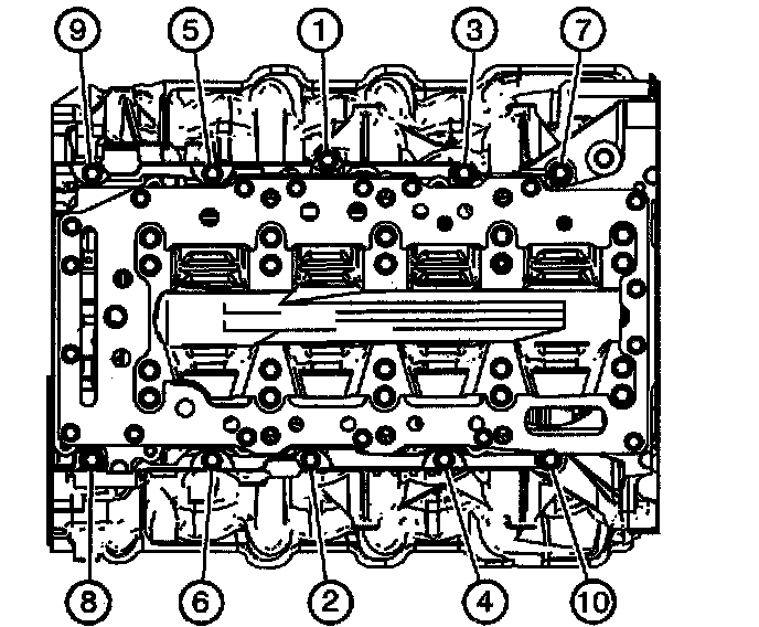 ^ Tighten the lower crankcase bearing bolts (1 through 20) to 20 Nm (15 ft. lbs.) in the proper sequence.