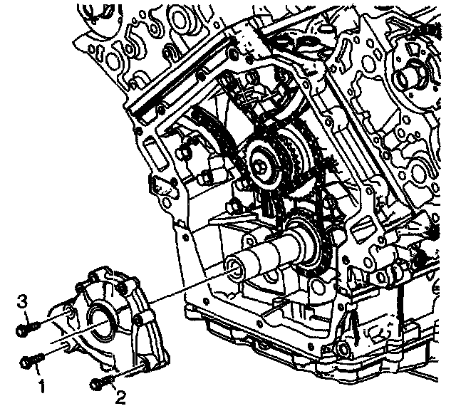 Tighten the Oil Pump bolts in the sequence (1, 2, 3) shown.