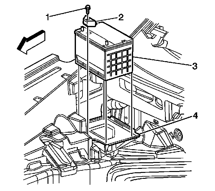 3. Remove the battery hold down retainer bolt (1) and retainer (2).