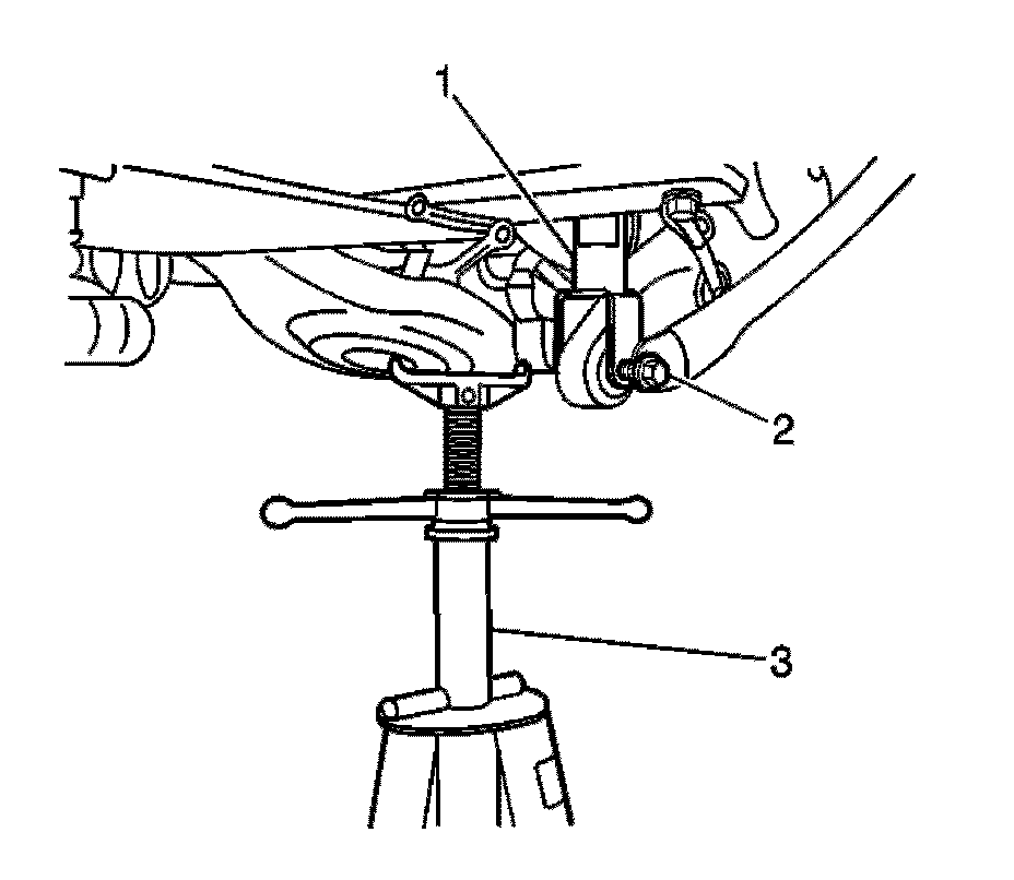 12. Raise the lower control arms using a suitable screw jack (3) in order to remove the load from the lower shock bolts (2).