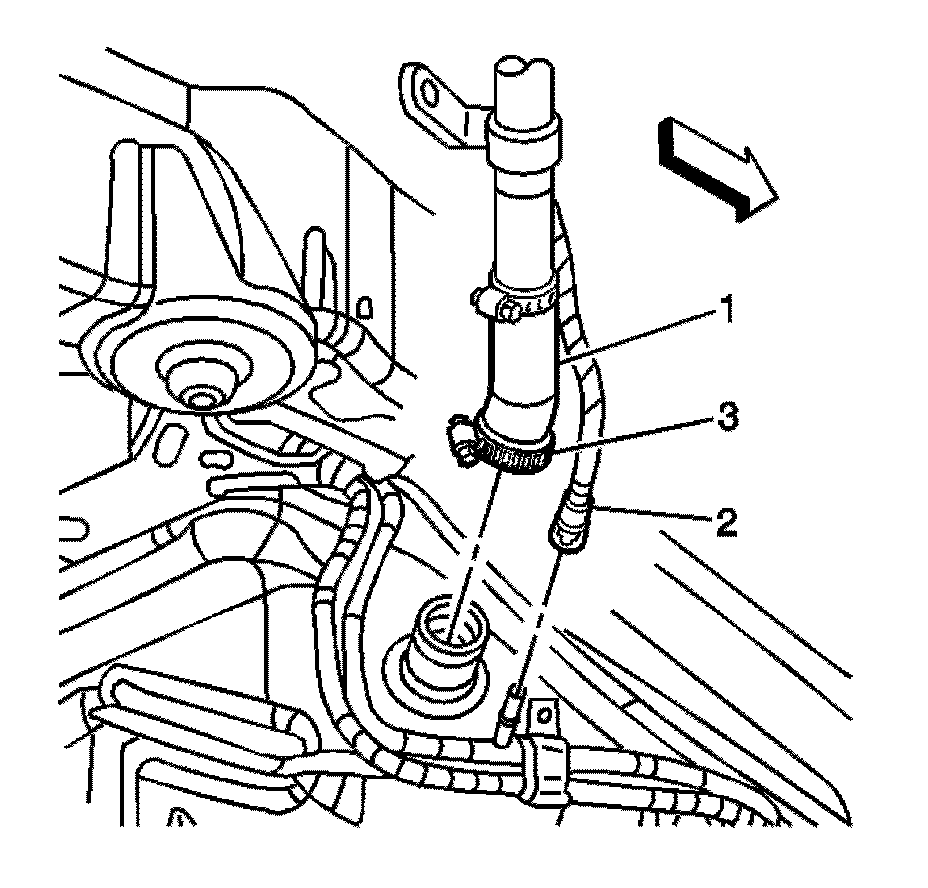 7. Connect the filler hose (1) to the fuel tank. Tighten the fuel filler tube hose clamp (3) to 3.5 Nm (31 lb in).