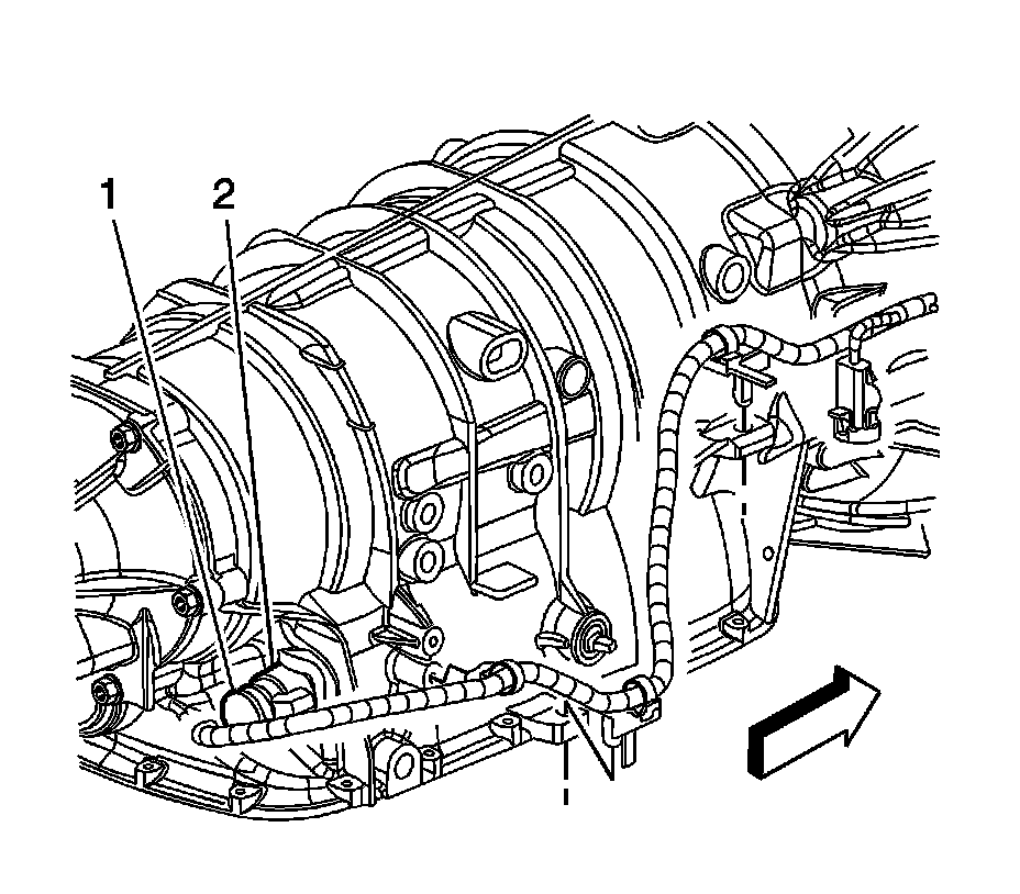 11. Disconnect the transmission wiring harness connector (1) from the transmission by rotating the locking latch (2) counterclockwise.