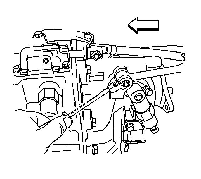 12. Using a flat-blade tool, release the left side shift control rod pin retainer. The graphic shows the transmission removed for clarity.