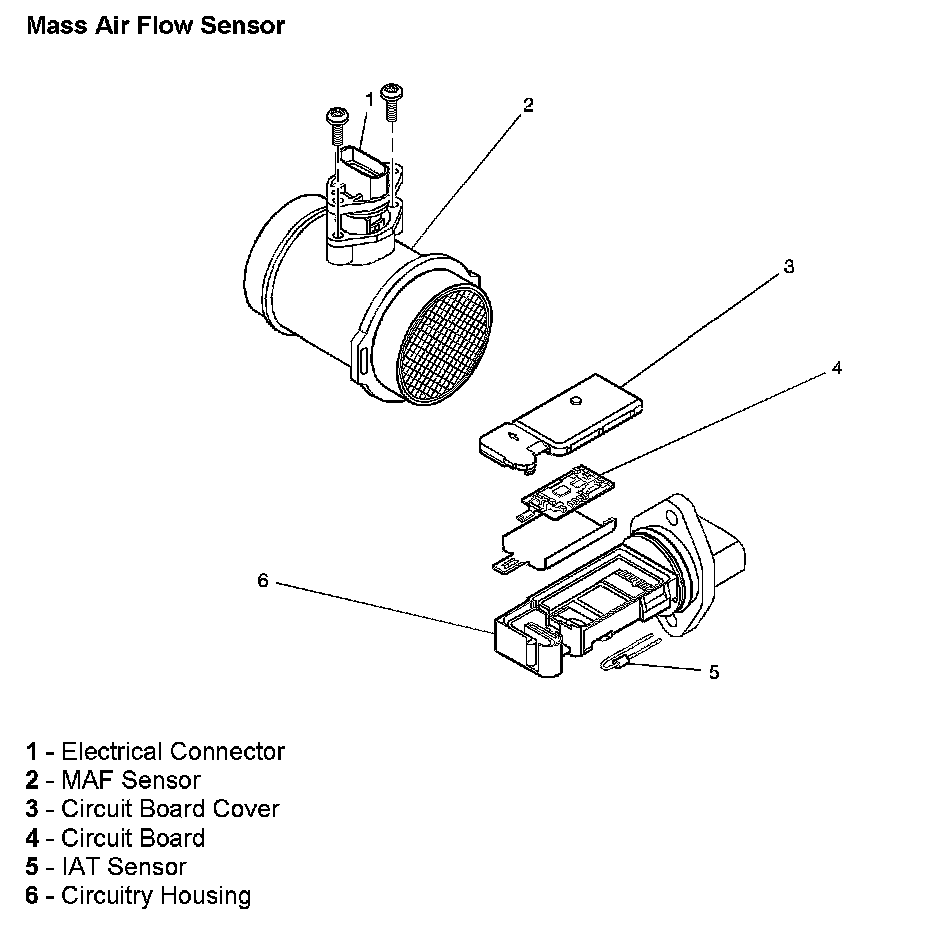 The MAF sensor measures the amount of air coming into the engine. This direct airflow measurement is more accurate than the calculated airflow information obtained from the other sensor inputs. The MAF sensor also houses an integrated intake air temperature (IAT) sensor. The MAF sensor uses the following circuits:
