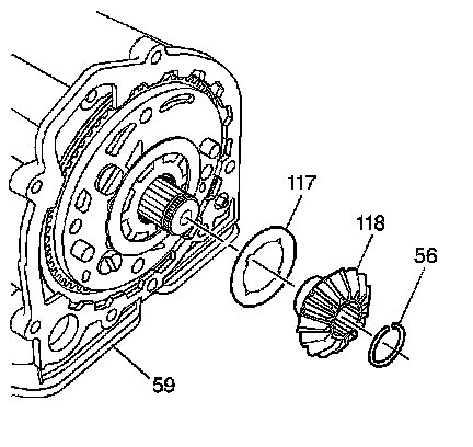 6. Remove the differential side gear (118) and thrust washer (117).