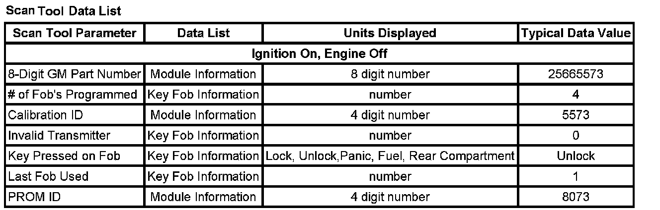 The Keyless Entry Scan Tool Data List contains all of the keyless entry related parameters that are available on the scan tool. The parameters in the list are arranged in alphabetical order. The column, Data List, indicates the location of the parameter within the scan tool menu selections. Use the Keyless Entry Scan Tool Data List as directed by a diagnostic table or in order to supplement the diagnostic procedures. Begin all of the diagnostic procedures with Diagnostic System Check - Vehicle. Use the Scan Tool Data List only after the following is determined:
