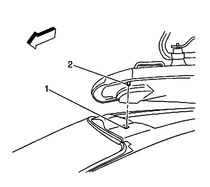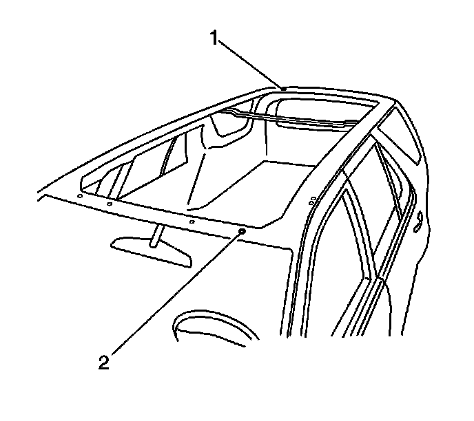 20. Ensure that the left front net hole (2) and the right rear corner alignment hole (1) are cleared of debris for installation of the new sunroof module.